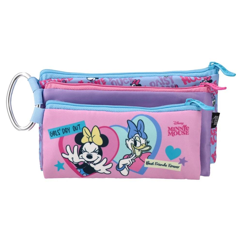 XL3 pencil bag featuring Minnie Mouse and Daisy Duck BFFs graphic. Trend-led pastel palette with heart motifs. Three zip compartments for organized storage. Fabric body with contrast zippers and a side metal ring for easy carrying or clipping. Eye-catching for kid-focused assortments.
