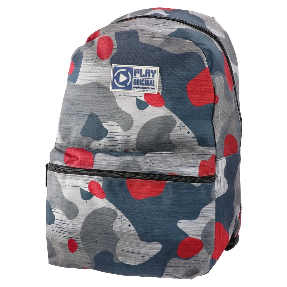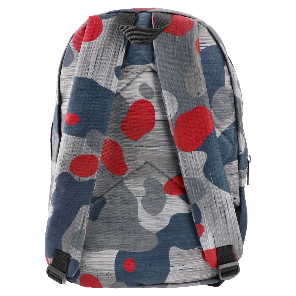 Xpack, backpack, X157 features a modern camo print in grey, navy, and red for a trend-forward look. The printed fabric shell and front logo patch enhance shelf appeal. A zippered main compartment and spacious front zip pocket offer practical storage for everyday assortments.