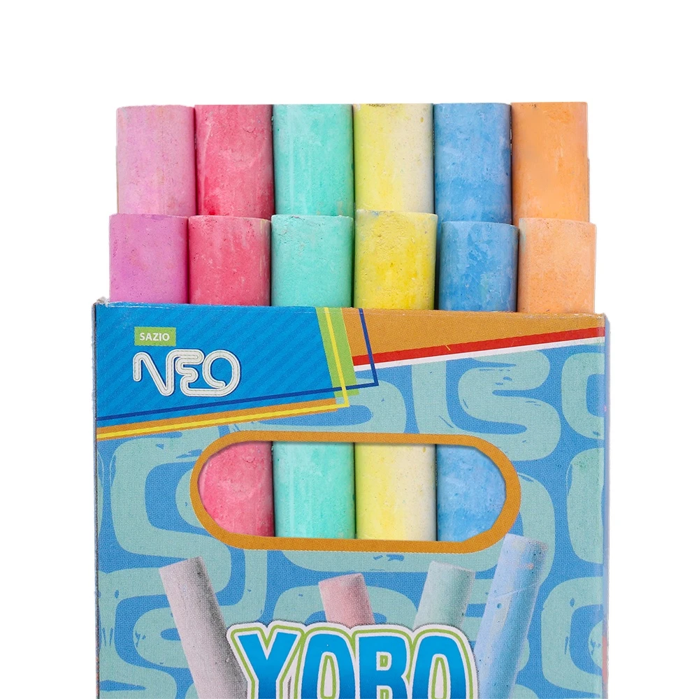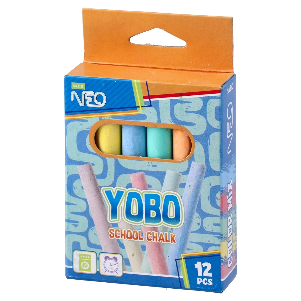 Yobo S, school chalk, color, 12pcs. Assorted pastel sticks for school boards. Cylindrical chalk in a compact, retail-ready cardboard box with viewing window and hang tab for easy merchandising. Trendy, eye-catching packaging supports strong shelf appeal.
